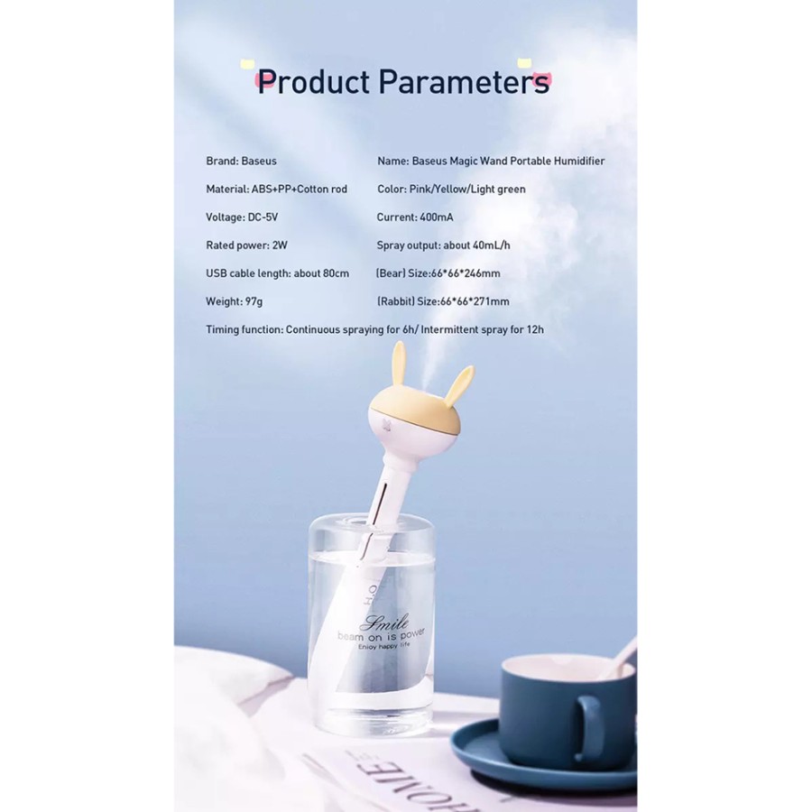Пересушене куряче повітря може погано позначатися на здоров'ї легких і дихальних шляхів, а також може мати ряд інших небажаних впливів, особливо на організм, що росте, саме тому зараз все більше входять у вжиток так звані зволожувачі повітря, і Baseus Magic Wand Portable Humidifier якраз з таких . Baseus Magic Wand Portable Humidifier – компактний портативний зволожувач із приємним дизайном та зручним форм-фактором, його легко переносити з собою. Принцип роботи даного зволожувача досить простий - наповнити посудину для води, що йде в комплекті, і встановити його в ньому. Цей зволожувач працює за системою ультразвукового зволоження, яка завдяки спеціальному механізму розбиває воду на дрібні частинки, перетворюючи її таким чином на пару без кип'ятіння. Рекомендується використовувати очищену воду, тому що від води з-під крана у пристрої, баку та на меблях може утворитися хлорний наліт. Об'єм бака для води – 380 мл, якої вистачить на 9 годин звільнення офісного кабінету або середніх розмірів кімнати. Запитується пристрої від проводу, що йде в комплекті, який можна підключити до звичайного USB блоку живлення. Baseus Magic Wand Portable Humidifier – якісний пристрій для освіження повітря, яких легко взяти із собою.